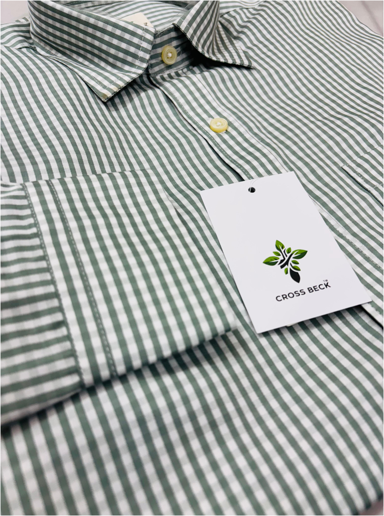 | product title-Cross Beck Pink Slim Fit Formal Shirt –checked pattern. product details- 🔹 Color: light green and white gingham 🔹 Fit: Slim Fit 🔹 Collar: Classic Spread Collar 🔹 Sleeves: Full Sleeves 🔹 Material: Premium Cotton blend 🔹 Design Detail: Button-down front with matching buttons, sleek finish |